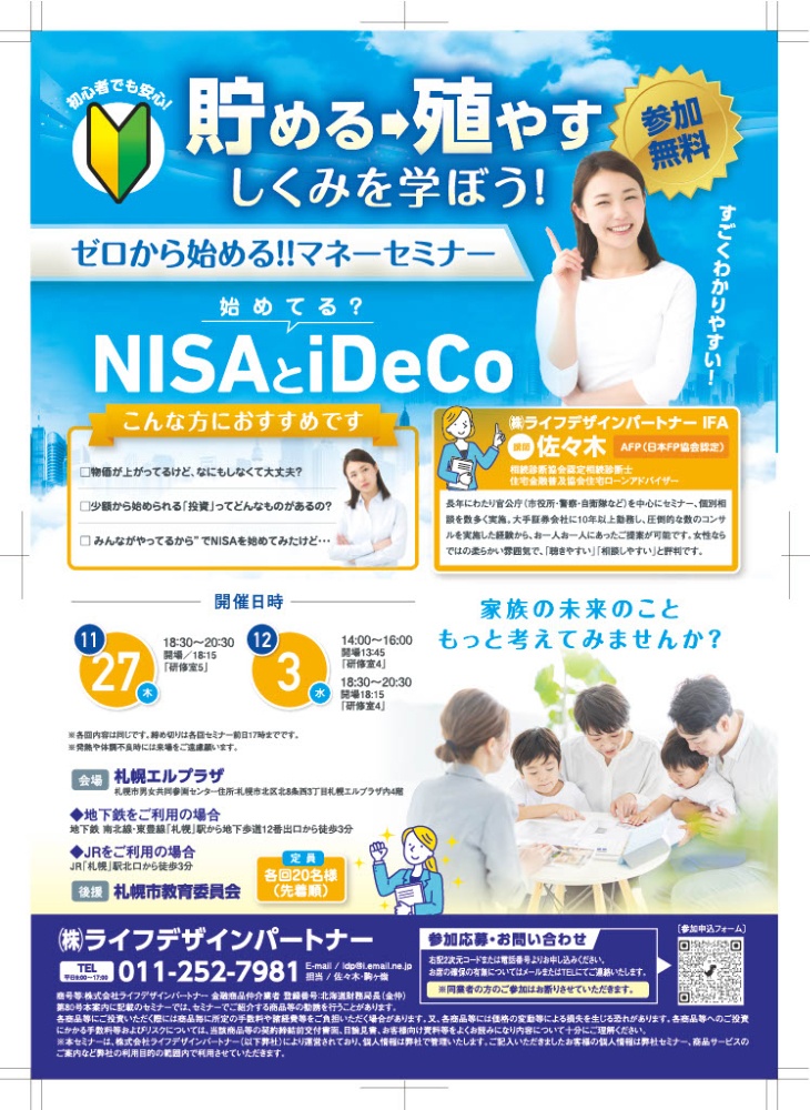 | 会場 | 札幌エルプラザ札幌市男女共同参画センター 11月27日(木)「研修室5」 12月3日(水)「研修室4」 |